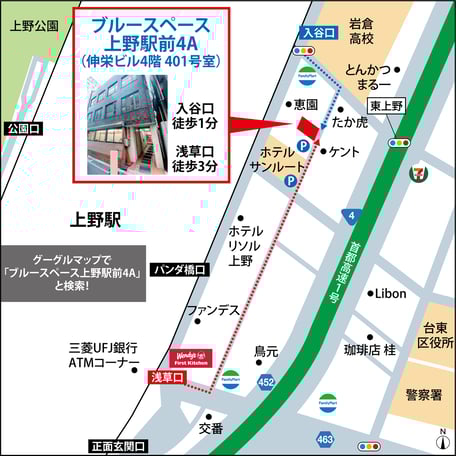 Google Mapにて「ブルースペース上野駅前4B」と入力いただければ場所が出てきます。